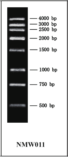 此 Marker 是由酶切產(chǎn)物和 PCR 產(chǎn)物混合而成,使用于瓊脂糖凝膠電泳中 DNA 條帶的分析。本產(chǎn)品為即用型產(chǎn)品,已加上樣緩沖液,可直接上樣電泳,每次上樣 5μl。1000~4000bp為質(zhì)粒酶切產(chǎn)物,3000bp和2000bp量帶為100ng,其它條帶DNA為50ng。
