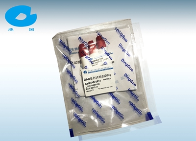 使用 方法: 將1 滴(約50μl)20X 的濃縮緩沖液(A)加入到850μl 蒸餾水中混勻。然后依次向緩沖液中加入1 滴20×的濃縮DAB 顯色劑(B)及1 滴20X 的濃縮過氧化氫溶液(C),充分混勻即為顯色劑工作液。若出現(xiàn)沉淀可過濾后使用。每張切片滴 1~2 滴新鮮配制的DAB 溶液,一般來說,室溫下染色時間約為 5 分鐘,顯微鏡下觀察 3~10 分鐘,顯色充分后自來水沖洗終止反應(yīng)。