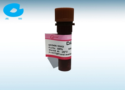 DAPI 是一種可以穿透細(xì)胞膜的藍(lán)色熒光染料。和雙鏈 DNA 結(jié)合后可以產(chǎn)生比 DAPI 自身強(qiáng) 20 多倍的熒光。DAPI 染色常用于細(xì)胞凋亡檢測(cè),免疫熒光檢測(cè)等。DAPI 的最大激發(fā)波長(zhǎng)為 340nm,最大發(fā)射波長(zhǎng)為 488nm;DAPI 和雙鏈 DNA 結(jié)合后,最大激發(fā)波長(zhǎng)為 364nm,最大發(fā)射波長(zhǎng)為 454nm。